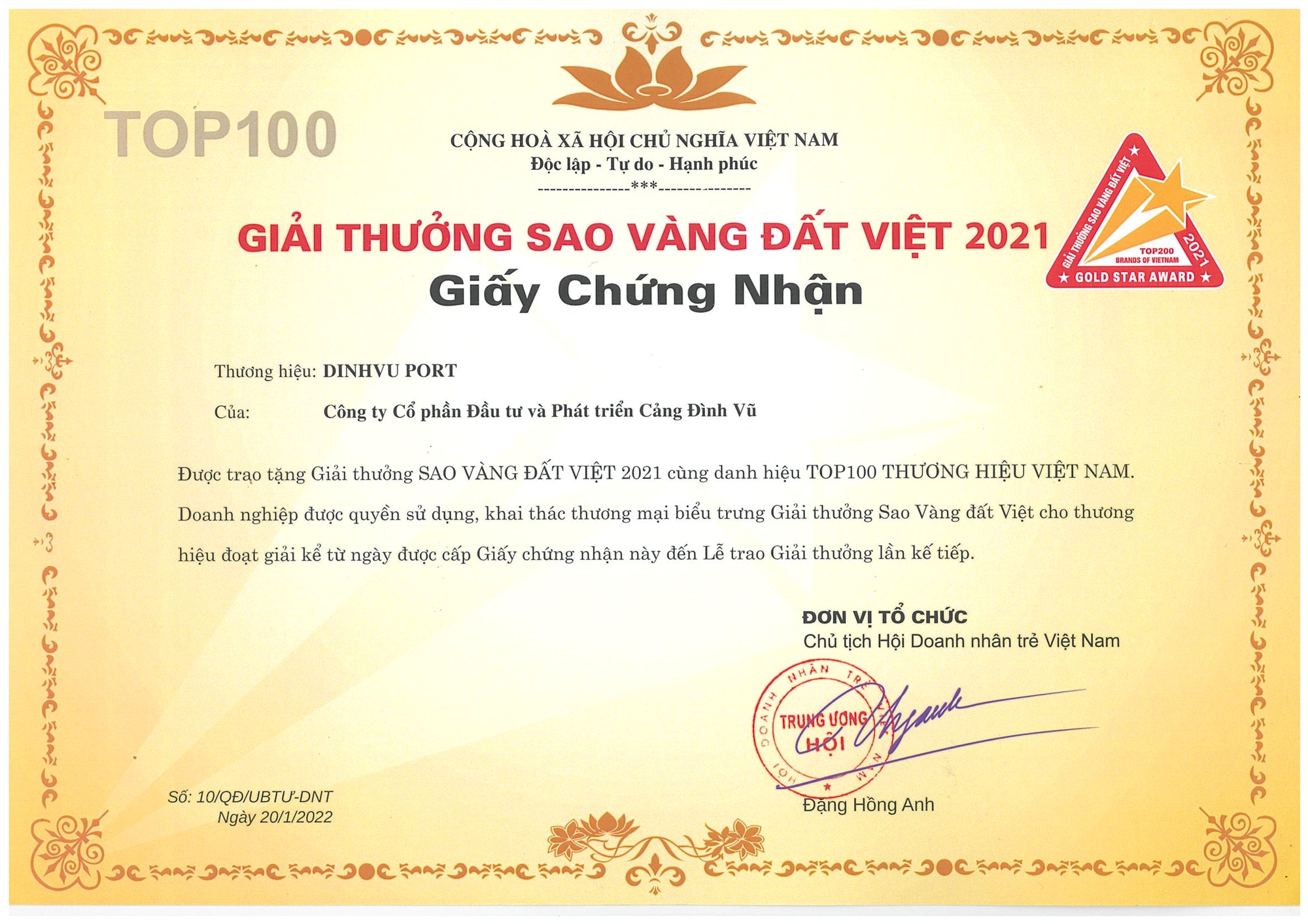 Ngày 30/03/2022, tại Trung tâm Hội nghị Quốc gia Việt Nam, Trung ương Hội Doanh nhân trẻ Việt Nam tổ chức Lễ trao Giải thưởng Sao Vàng Đất Việt 2021 để tôn vinh TOP10/TOP100/TOP200 Thương hiệu tiêu biểu Việt Nam. Cảng Đình Vũ lần thứ tư liên tiếp được vinh danh Top 100 trong Lễ trao giải.