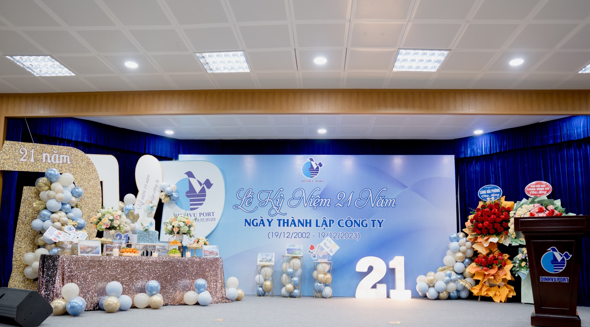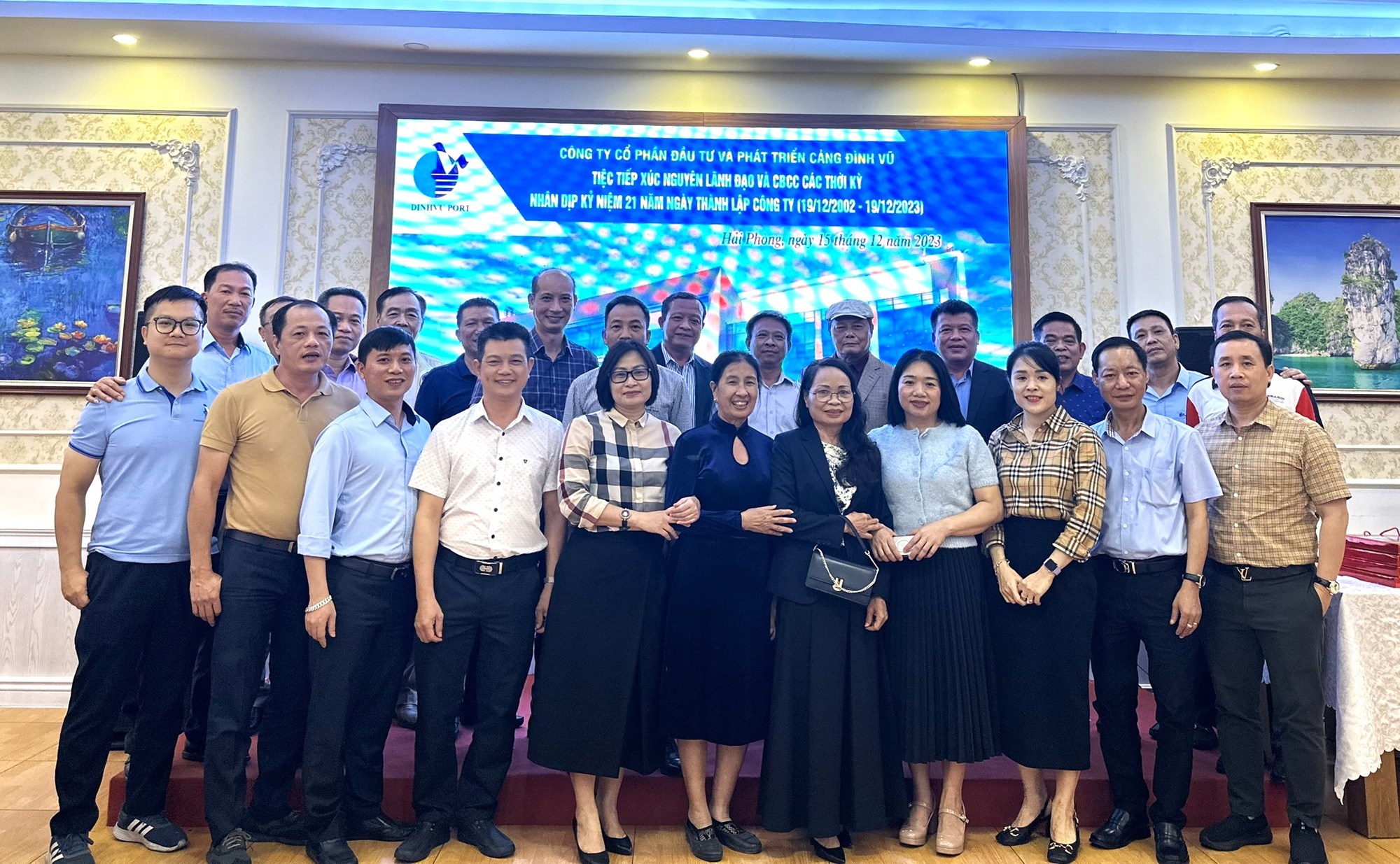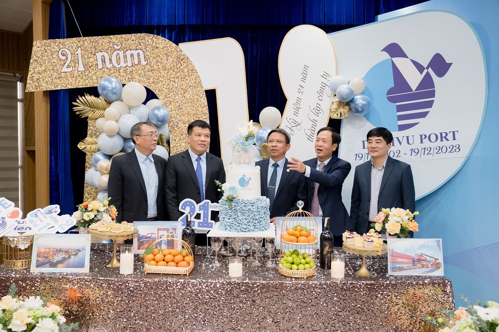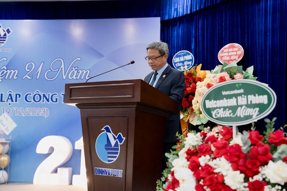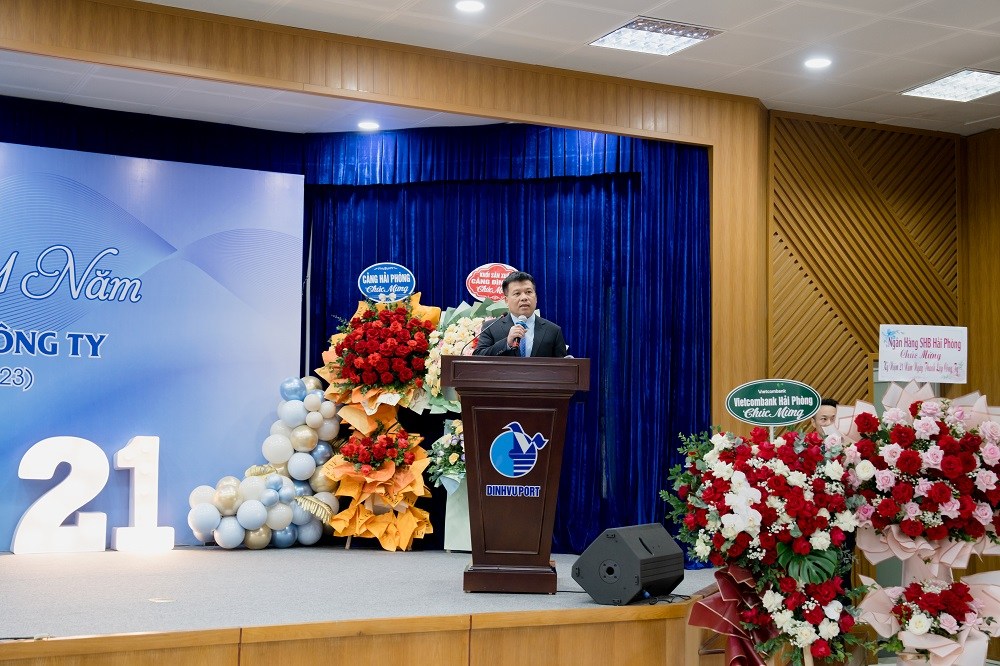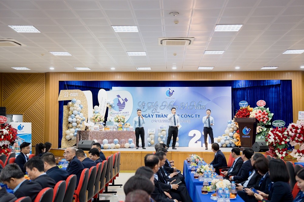 Sáng ngày 19/12/2023 Cảng Đình Vũ long trọng tổ chức Lễ kỷ niệm 21 năm ngày thành lập tại Hội trường Công ty với sự tham dự của các thành viên Hội đồng quản trị, Ban kiểm soát, Ban điều hành Công ty cùng hơn 150 cán bộ chủ chốt và nhân viên tiêu biểu đại diện cho các đơn vị phòng ban trong toàn Công ty. Đại diện lãnh đạo Cảng Hải Phòng: Ông Phạm Hồng Minh – Chủ tịch HĐQT Công ty và Ông Chu Minh Hoàng – Phó TGĐ Công ty cũng đã đến tham dự sự kiện, gửi lời chúc mừng và tặng quà tới tập thể lãnh đạo và CBCNV Cảng Đình Vũ.