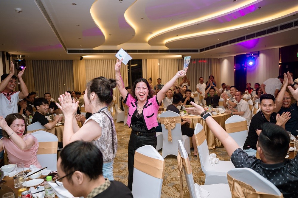 Đến với gala dinner chủ đề “Chắp cánh vươn xa – Thăng hoa cảm xúc”, chỉ với 2 trò chơi đơn giản là Hiểu ý đồng đội và Nối từ, toàn bộ khán phòng đã bị rung chuyển bởi những tràng cười không ngớt và vô vàn biểu cảm hài hước của các thành viên tham gia. Các ca sĩ, MC, cùng vũ đoàn xinh đẹp đã tiếp thêm nguồn năng lượng tích cực cho chương trình với những ca khúc sôi động và không khí gắn kết tuyệt vời.