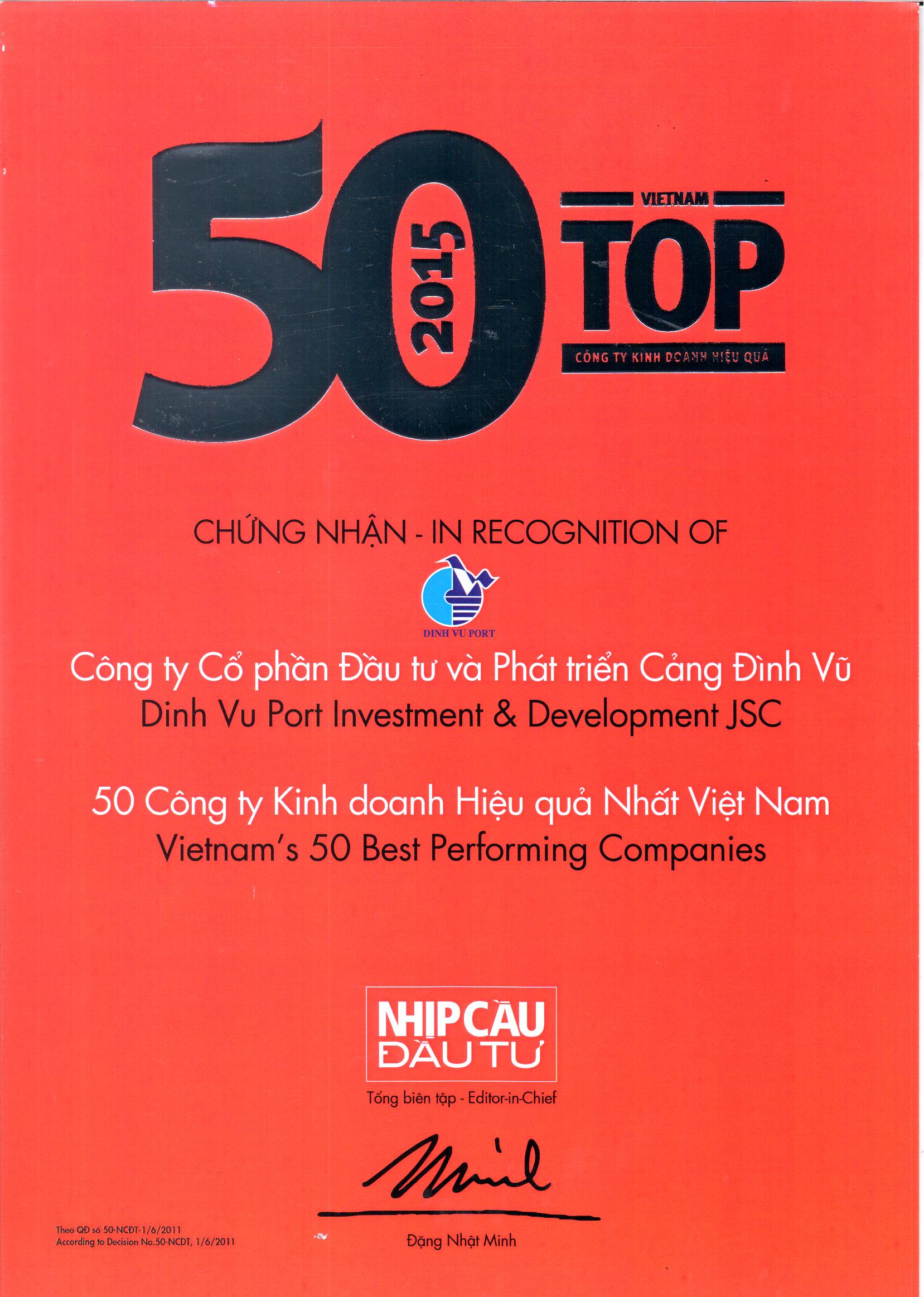 Đây là lần thứ ba liên tiếp, Công ty Cổ phần Đầu tư và Phát triển Cảng Đình vũ lọt trong "Top 50 công ty kinh doanh hiệu quả nhất Việt Nam"