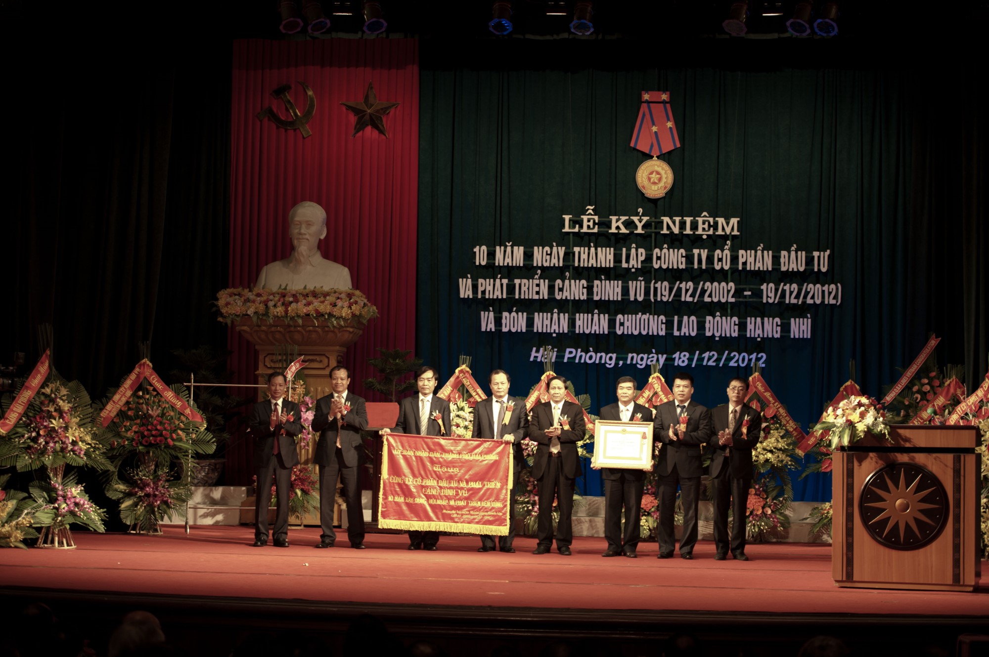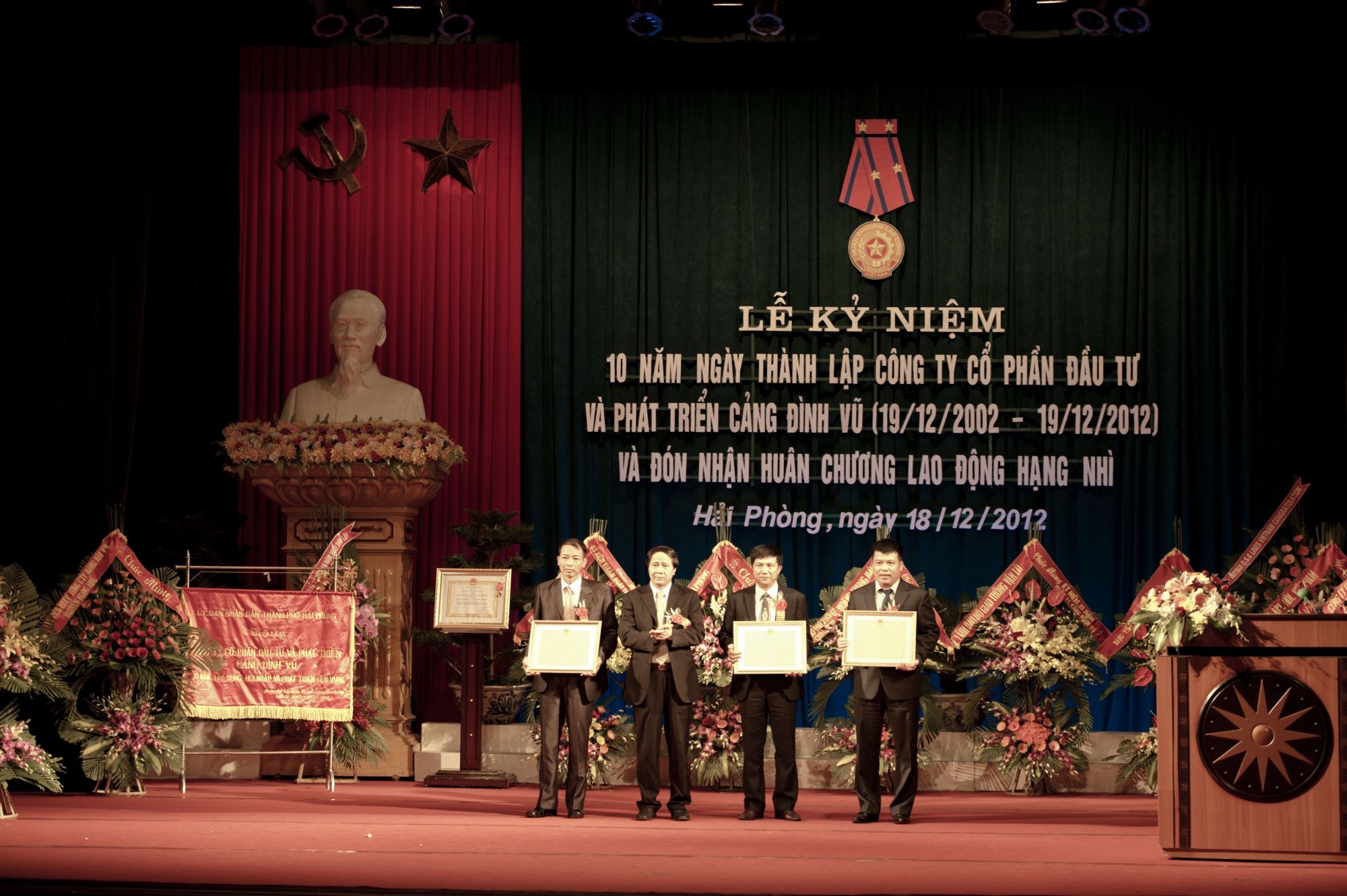 Đặc biệt trong buổi lễ để vinh danh những thành tích xuất sắc của toàn thể CBCNV Cảng Đình vũ đã không ngừng nỗ lực phấn đấu xây dựng Cảng Đình vũ trở thành thương hiệu Cảng Đình vũ vững mạnh có uy tín trong khu vực và quốc tế, Ông Lê Văn Thành- Phó Chủ tịch UBND TP Hải phòng thay mặt Chủ tịch nước trao tặng CBCNV Cảng Đình vũ Huân chương lao động hạng nhì và tặng Bức trướng của UBND thành phố mang dòng chữ